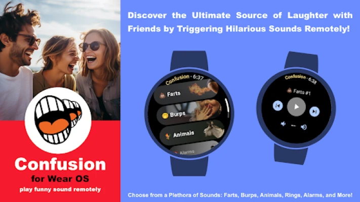 Transform Your Wear OS Smartwatch into the Epitome of Fun and Entertainment! Discover the Ultimate Source of Laughter with Friends by Triggering Hilarious Sounds Remotely! Choose from a Plethora of Sounds: Farts, Burps, Animals, Rings, Alarms, and More!