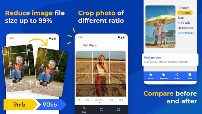 Compress Photos app lets you resize images more accessible than ever! With the image resizer feature, you can adjust your images to your desired dimensions, ensuring they fit perfectly in any digital medium or social platform. So whether you need to crop photos to a specific aspect ratio or downsize it for quicker online sharing, the photo size reducer app has got you covered.