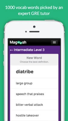 Build your vocabulary with Magoosh's free GRE vocabulary game for your Android device. Quiz yourself every day to learn the 1200 most important words on the GRE test! Our app helps you improve your vocab and prep for the GRE test – now you can practice and improve your vocabulary anywhere, any time!
