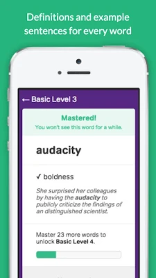 Each level you beat unlocks a harder one: more words and more advanced vocabulary. Words you don't know will be repeated until you master them, using spaced repetition which has been shown to be a very effective memorization strategy.